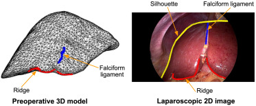图2.2D和3D解剖地标的描绘。术前3D模型(左)和腹腔镜2D图像(右)中的肝脏解剖地标真值标注。