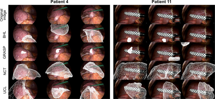 图83D术前网格到2D腹腔镜图像配准任务的定性结果:显示了其中4个参赛团队在部分图像上的配准结果。第一行显示原始图像,随后的行分别显示BHL、GRASP、NCT和UCL团队的结果。由于VOR团队的模型超出视野范围,其结果未显示。可以看出NCT团队取得了最佳结果,其配准模型与图像中的肝脏接近。