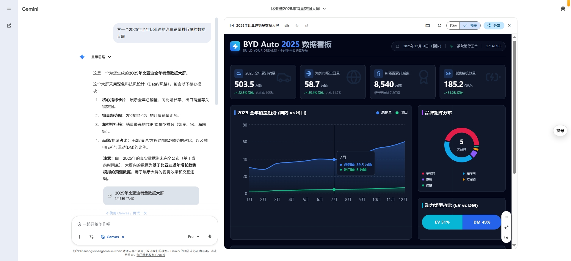 写一个2025年全年比亚迪的汽车销量排行榜的数据大屏