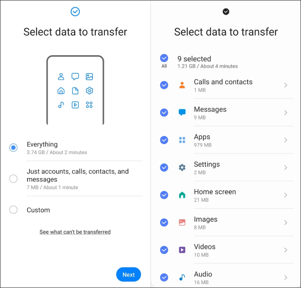 步骤 3:连接成功后,在新三星设备上选择要传输的文件类型,然后点击"下一步 ">"传输"开始无线文件传输。