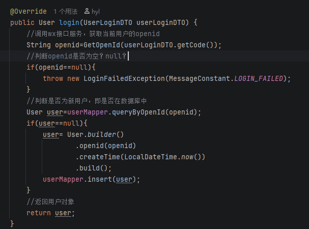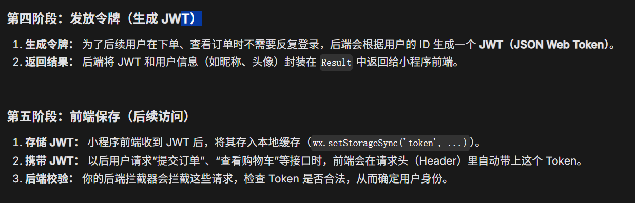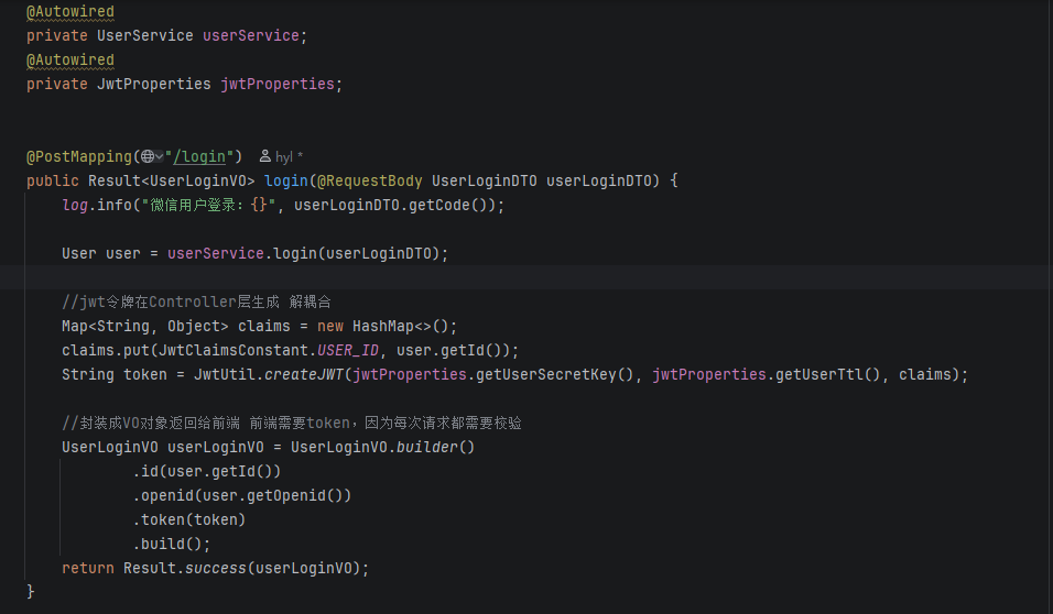 其实userService.login本质上就是在完成上面的二阶段和三阶段。下面的代码就是完成四和五两个阶段,也就是生成JWT令牌并且返回给前端!