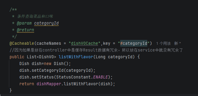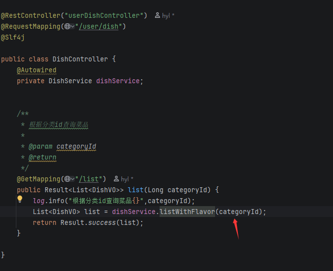 没必要看接口了,前端点击了一个category的bottom这个bottom是由前面的分类查询查找出来的,所以会有一个categoryId点了bottom就会将该分类的categoryId传给后端,后端根据分类Id查询菜品,菜品返回给前端的是一个VO对象,这个对象不仅仅包括了菜品的信息,也包括了该菜品的Flavor所以要操作两个表。下面是service的代码: