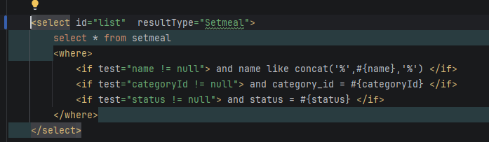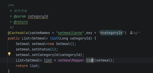 这里讲一下为什么需要用Setmeal对象去Mapper查询,本质上就是构造一个通用的查询方式,当然我们只用categoryId也可以查询的,是为了后续设计更多的精确查询,比如输入套餐的部分名字也可以查询到想要的套餐。