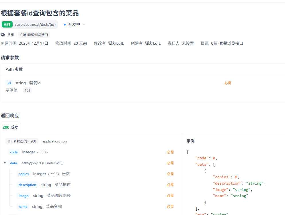 最后套餐查询有一个特殊的点,就是查询套餐的具体内容,因为一个套餐可以包括多个菜品所以它具备具体的内容,多一个接口。接口文档如下: