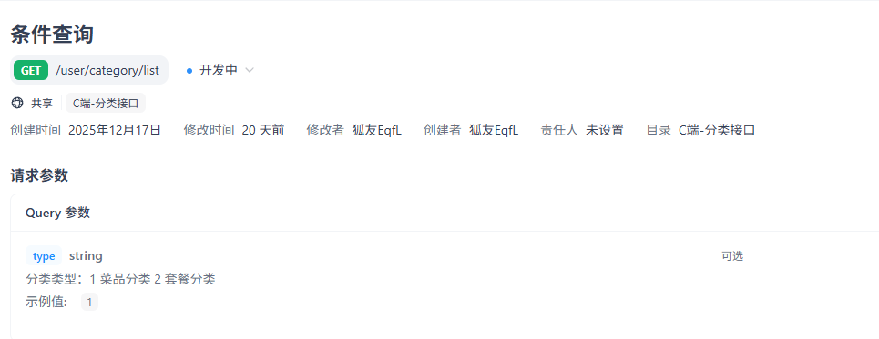 首先是我们的分类查询:定义了一个categoryController,查询接口文档定义如下: