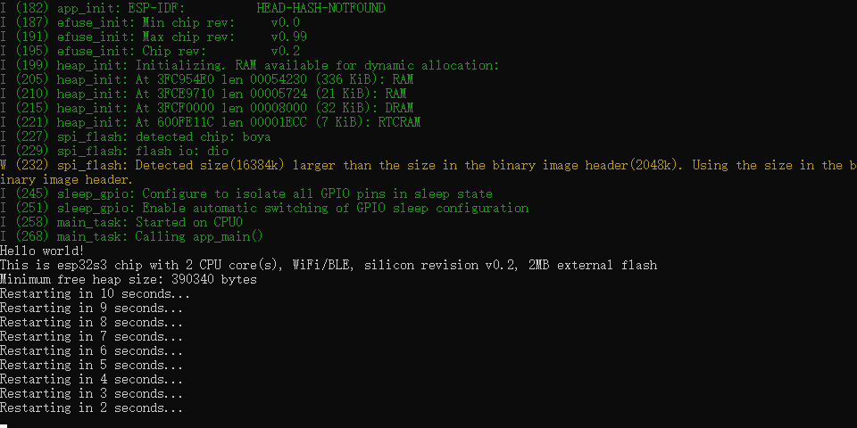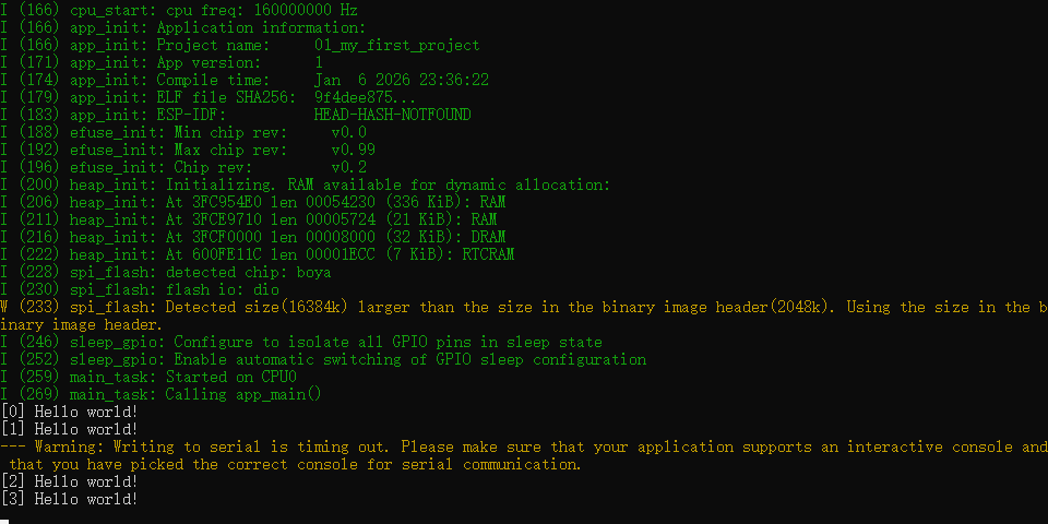 需要退出调试模式,可以按键盘的Ctrl+],到这里,我们就成功完成工程创建、编译、烧录的全部步骤。