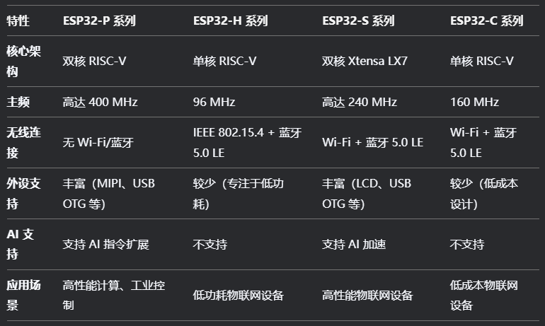 - ESP32-P 系列:适合需要高性能计算和丰富外设的应用,如工业控制、智能家居中枢。