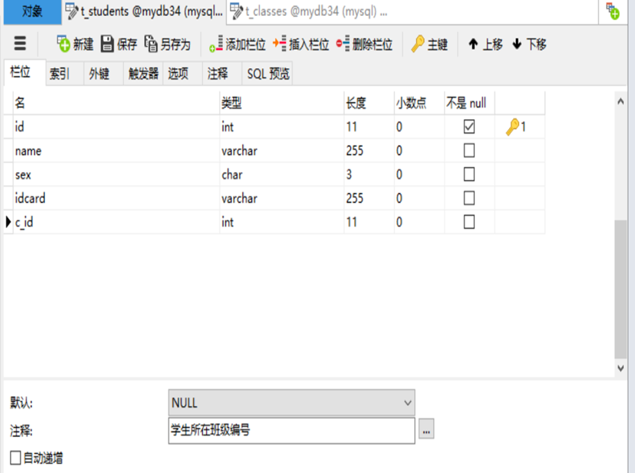 id(学号),name(学生姓名),sex(性别),idcard(身份证号码),c_id(班级编号)