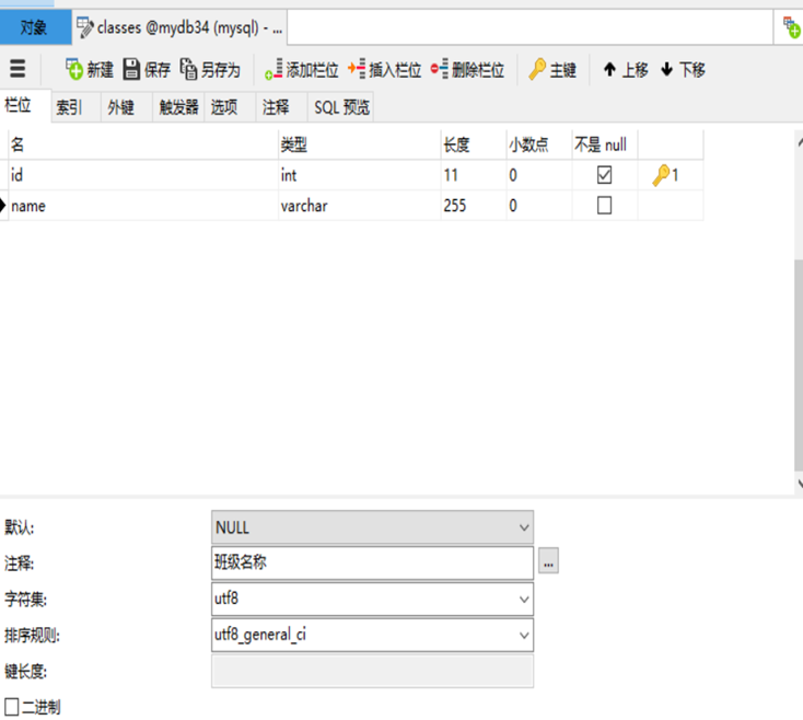 id(班级编号),name(班级名称)