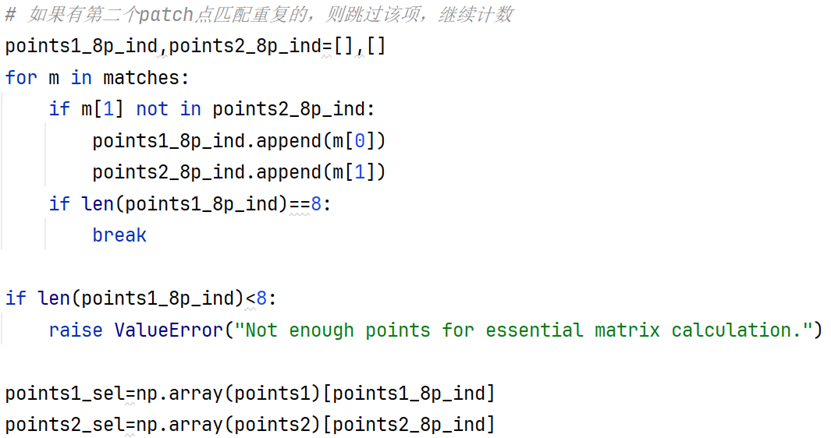 对于得到的1000个角点,需要计算特征矩阵以进行特征点的匹配,注意不是说这两张图片的1000个点一定是完全一一对应,而且我们在第4部分只需要8个特征点对,因此在双for循环匹配完成后,我们根据ssd的指标取匹配度最高的8个单射作为匹配区域。
