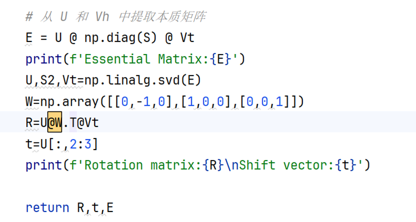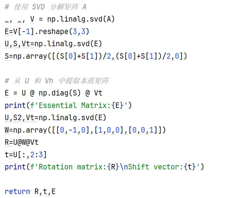 目前关于对极约束和本质矩阵计算的原理笔者还不了解。但代码是可以写出来的。8x9的非方阵矩阵不能够使用特征对角分解,所以使用SVD进行矩阵分解。