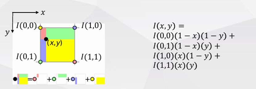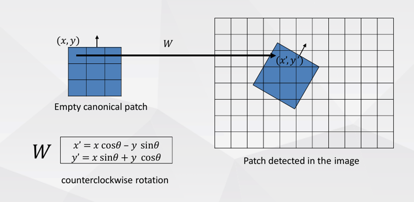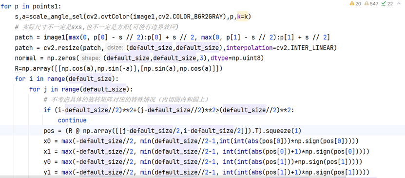 接下来只需要计算特征张量,注意前述的最佳尺寸和角度是在灰度空间中计算,而特征张量是HWC的彩色空间张量。先根据确定的最佳尺寸切片出空间尺寸未旋转的mxmx3的patch,使用双线性插值变为8x8x3;使用线性代数的知识,构造旋转矩阵,从全0张量根据最佳角度旋转到和切片patch"朝向一致",但注意旋转的时候需要先做一个坐标中心和张量空间中心对齐的前后平移处理(存在负数坐标,确保旋转的物理意义);使用双线性插值,注意只对内切圆内部和内切圆上的像素点计算数值,避免旋转超出空间边界数据无效的情况。
