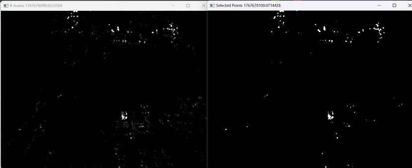 使用Harris角点检测器,此处把0-255的像素值在计算的时候进行了归一化处理,确保Harris像素点特征值的范围在经典范围之内,静态阈值体系可以共通,但本文使用的是动态阈值,根据最大角点特征值乘以阈值比例系数计算动态阈值。