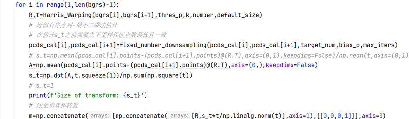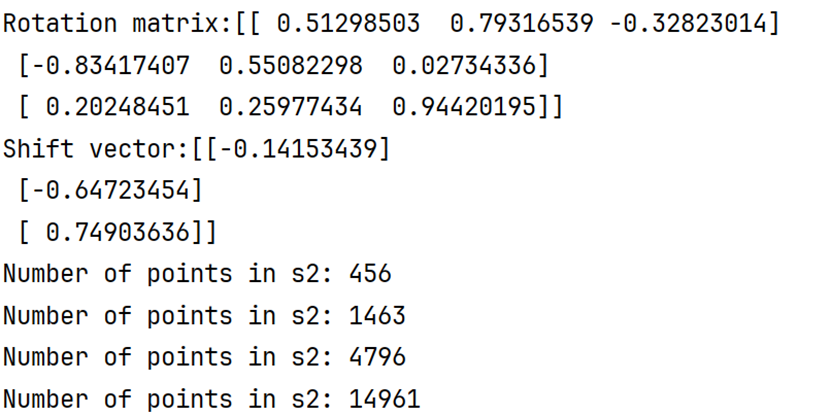 但由于最小二乘法不仅需要点数一致,还严格依赖两组点云的顺序或者对应关系。本算法在处理顺序对应关系上的策略还有较大的优化空间,目前通过排序(从小到大)的方式对应,但实际上受到物理场景和点云集群分布的影响,固定点数下采样之后得到的点云序列基本上没有什么对应关系,同理在下采样之前的点云因为深度信息的缺失,960x540=518400约52万个点实际只有27万左右的有效3维点,在一开始两组点云的点就不是一一对应。