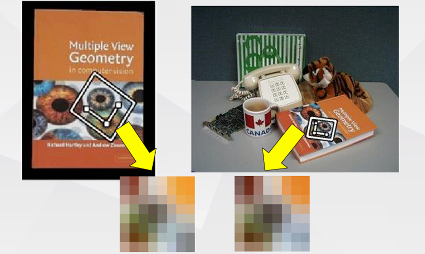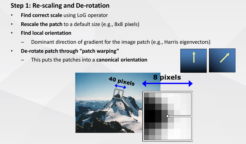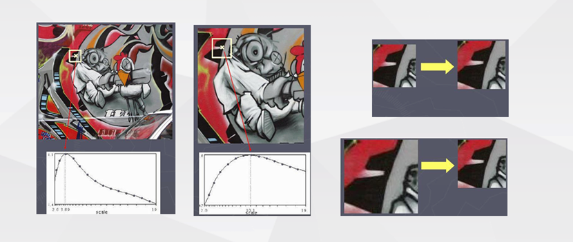很显然,每个特征点代表着灰度图片亮度变化剧烈的地方,那这里自然包括变化剧烈是朝着哪个方向去的、以及这里的轮廓信息的隐藏空间尺度(patch大小)信息。课内讲授的时候并未具体说明用什么指标选择最佳尺度,我查阅了课外资料,最终选择了灰度图空间下的patch的标准差(numpy.std)作为指标,实验结果证明是合适的指标。