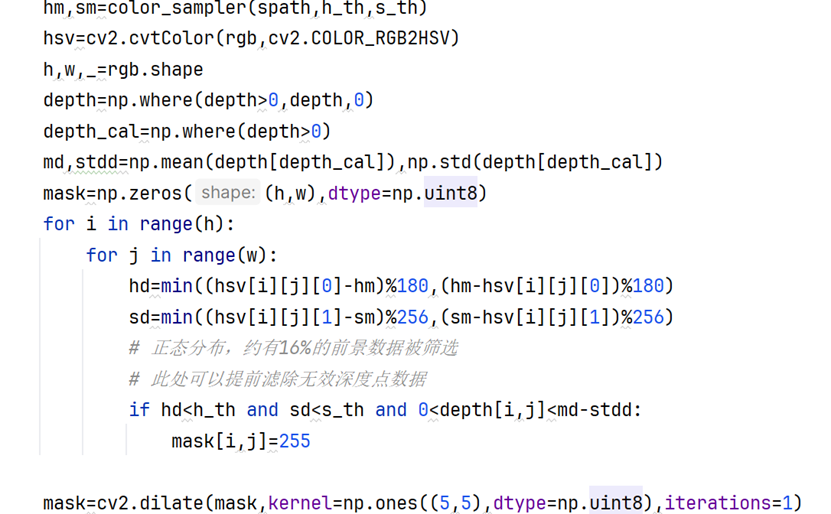 这样通过颜色滤波-深度滤波,得到的目标像素点集合和物体像素点集合就更相近了,在此基础上引入膨胀算法增强目标像素点集合的空间连续性,迭代1次,kernel核是5x5的全1矩阵。