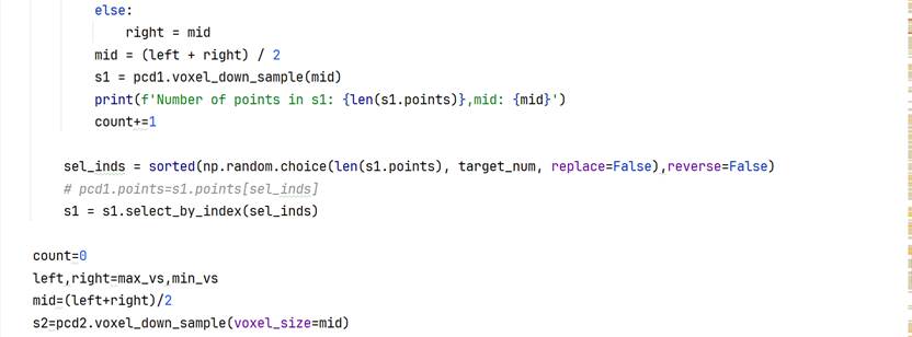因为最小二乘法要求两个远景点云集群点数一致,所以需要先进行固定点数的下采样,open3d库没有直接提供FPS(Furthest Point Sampling,不是帧率或者战术射击游戏)最远点采样算法,该算法可以在保持点云基本的空间分布的前提下实现固定点数采样。