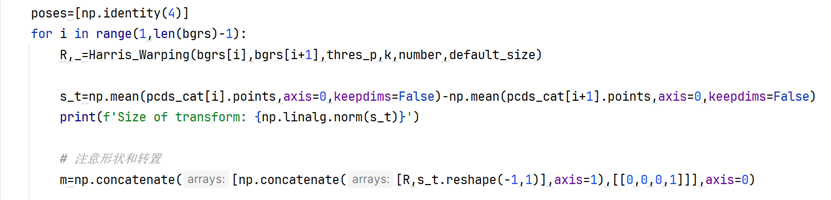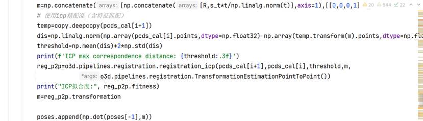有趣的是,这里的t确实百分百含量是一个单位向量(numpy.linalg.norm验证为1)。但实际过程中,在3D视觉算法中,变换矩阵是一个4x4的矩阵,在点云拼接部分只需要把R和t拼接起来即可。