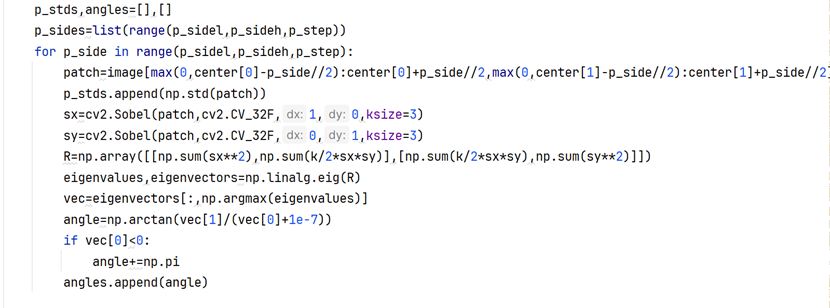在这里首先在候选尺寸列表(本算法设定4到38,步长2)里面,对于每一个尺寸应用Sobel-X和Sobel-Y算子,然后同样构建一个类似Harris算子-M矩阵的点相特征矩阵;然后进行特征对角分解,选取主导的特征向量(特征值较大的那个)反正切函数计算得到朝向角度。这样,1000个特征点每个点都有(38-4)/2+1=18个角度和18个std标准差。根据标准差选择最佳尺度和对应角度即可。