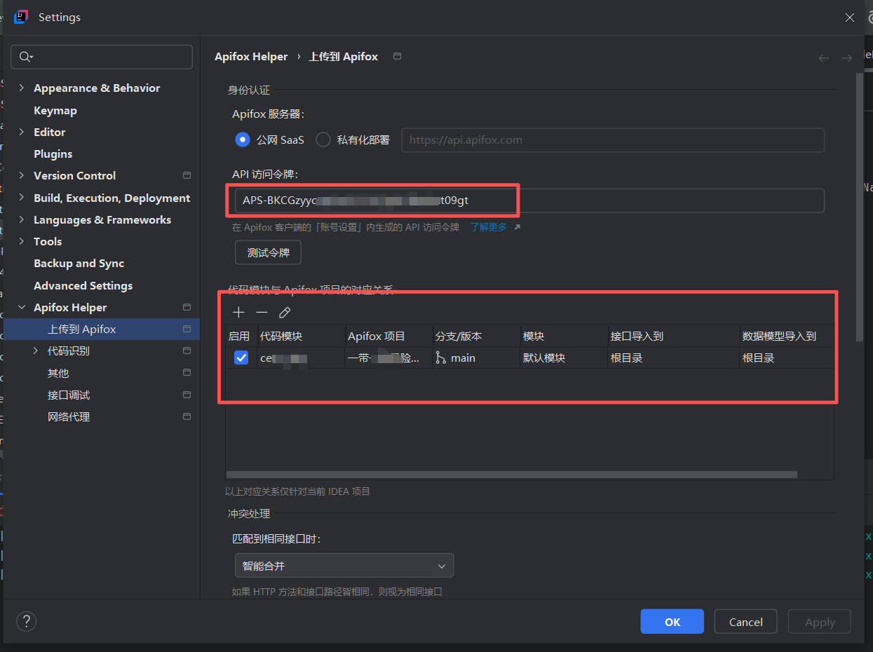 打开 IDEA 的设置菜单,导航到 Apifox 插件配置页面。输入 Apifox 账户的 API Key ,可以测试key是否成功,点击➕添加你的项目,确保插件能够访问 Apifox 项目数据。