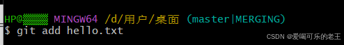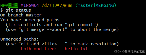 注意:此时使用 git commit 命令时不能带文件名。因为我们解决冲突,可能存在于多个