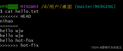 特殊符号:<<<<<<< HEAD 当前分支的代码 ======= 合并过来的代码 >>>>>>