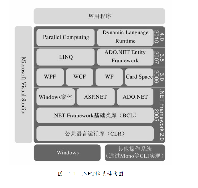 从图1-1中可以看出,.NET框架是在操作系统之上、应用程序之下的一个抽象层,它就像一台虚拟的电脑,负责管理运行在它之上的各种.NET应用程序的方方面面。理论上,该框架是跨平台的,基于其上的应用程序也是跨平台的。只是微软官方只提供了基于Windows平台的.NET框架实现,同时,由其他开源团体提供了基于非Widows平台的.NET框架实现,例如Mono。另外,从图1-1中还可以看到,.NET框架自身的功能随着版本的升级而变得越来越丰富,.NET框架的每一次升级都会给我们带来许多惊喜,最近的4.0也不例外,提供了很多好用的新功能,具体内容会在后面的章节中一一介绍。使用.NET可以开发各种各样的程序,从网络应用到桌面应用,再到嵌入式系统应用和手机应用,甚至是分布式的企业级应用。