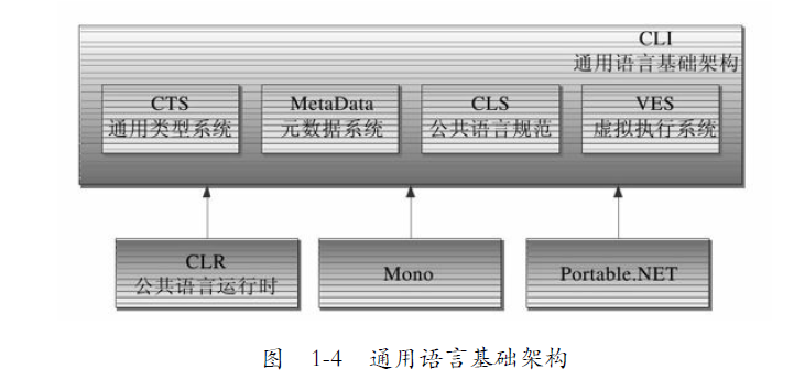 CLR是CLI这一规范的一种实现,前面提到的Mono和Portable.NET是另外两种实现,它们的关系如图1-4所示。
