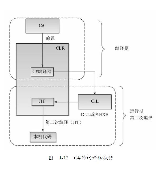 (1)在编译期,CLR对C#代码进行第一次编译,生成中间代码的DLL或者EXE。
