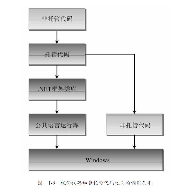 另外,托管代码和非托管代码还可以互相调用,具体内容会在1.6节介绍,如图1-3所示。