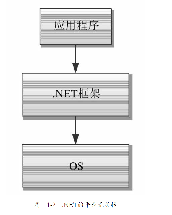 从某种意义上说,.NET框架可以看作是.NET应用程序运行的虚拟机环境,它为.NET应用程序提供编译、运行、内存管理、垃圾收集、安全等服务。换句话说,.NET程序不需要与操作系统直接打交道,只需要和.NET框架打交道就可以了。从这个意义上讲,基于.NET框架开发的应用程序在理论上都是跨平台的,只需要.NET框架有相应平台的实现版本即可。这就是.NET的"平台无关性",具体内容会在1.2节中介绍,如图1-2所示。