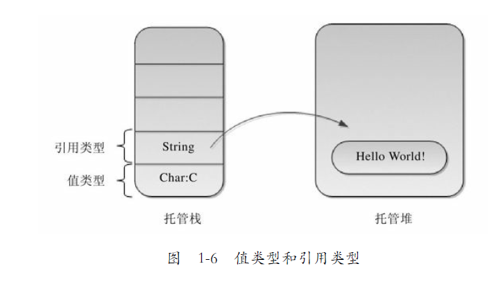 值类型的变量直接存储数据,而引用类型的变量持有的是数据的引用,数据存储在堆中。例如我们常见到的String、Class、Interface等就是引用类型,而Char、Int32、Boolean等都是值类型。对于引用类型数据而言,由于数据存储在堆中,指向它的引用可能不止一个,因此当其他引用对数据进行修改时会影响到别的引用,如图1-6所示。
