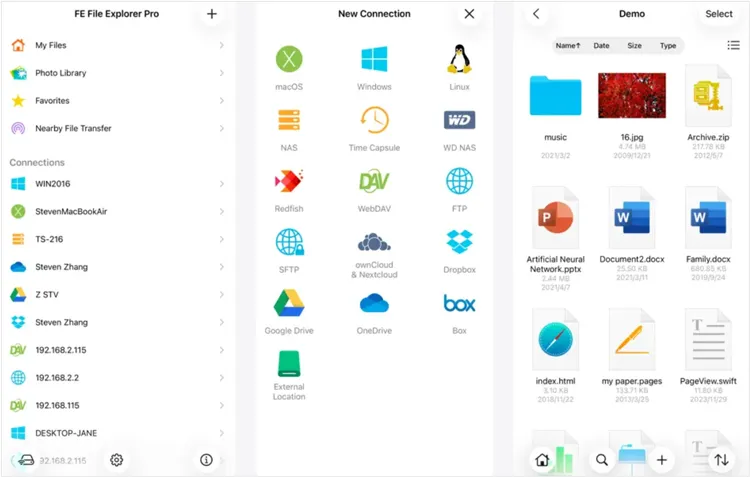 对于"高级用户"来说,FE 文件资源管理器是连接性的黄金标准。它几乎可以连接到任何设备:Windows 共享(SMB)、SFTP、WebDAV,甚至 NAS 设备(Synology/QNAP)。它让你的 iPhone 感觉就像一台真正的工作站。
