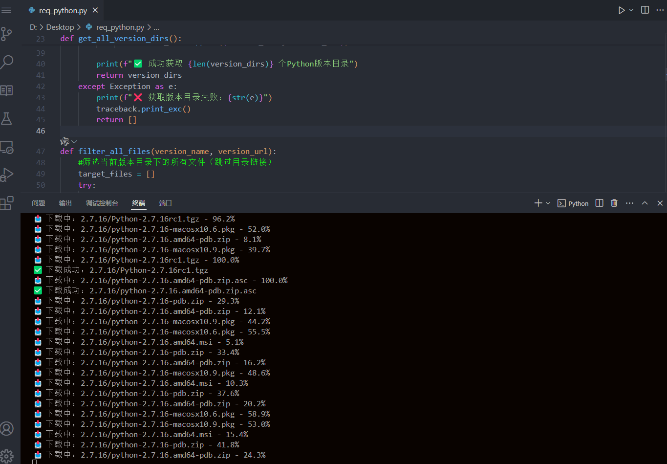 本次分享的爬虫脚本,完美解决以上痛点:✅ 无需手动复制任何下载链接✅ 自动爬取 Python 官网 FTP 的所有版本目录 + 每个版本下的全部文件 ✅ 支持多线程并发下载 ,下载速度拉满✅ 支持断点续传 ,网络中断后重新运行即可继续下载,无需从头再来✅ 禁用系统代理,解决因代理配置导致的下载失败 / 超时问题✅ 自动创建版本目录,文件按版本号分类存储,本地目录整洁有序✅ 失败自动重试 + 完整异常捕获,稳定性拉满