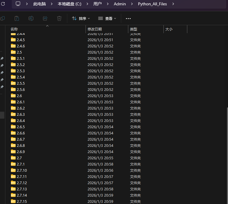 脚本会自动按「Python 版本号」创建文件夹,所有文件归类存储,目录结构非常整洁: