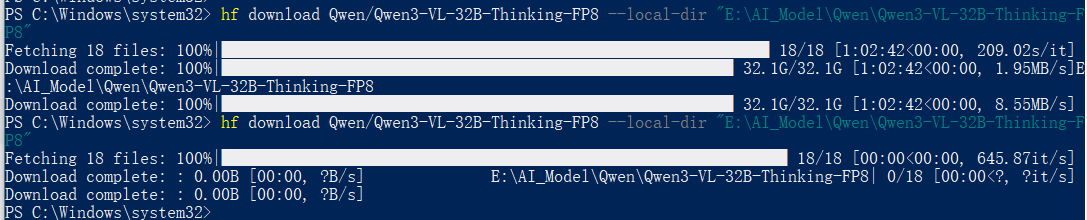 powershell# 下载模型到 D:\models\Qwen3Guard-Gen-8B(可自定义路径) python -m huggingface_hub snapshot download Qwen/Qwen3Guard-Gen-8B --local-dir D:\models\Qwen3Guard-Gen-8B --local-dir-use-symlinks False # 此处我使用以下命令下载Qwen3Guard-Gen-8B模型,用于本机测试 hf download Qwen/Qwen3Guard-Gen-8B --local-dir "E:\AI_Model\Qwen\Qwen3Guard-Gen-8B"下载完成截图如下: