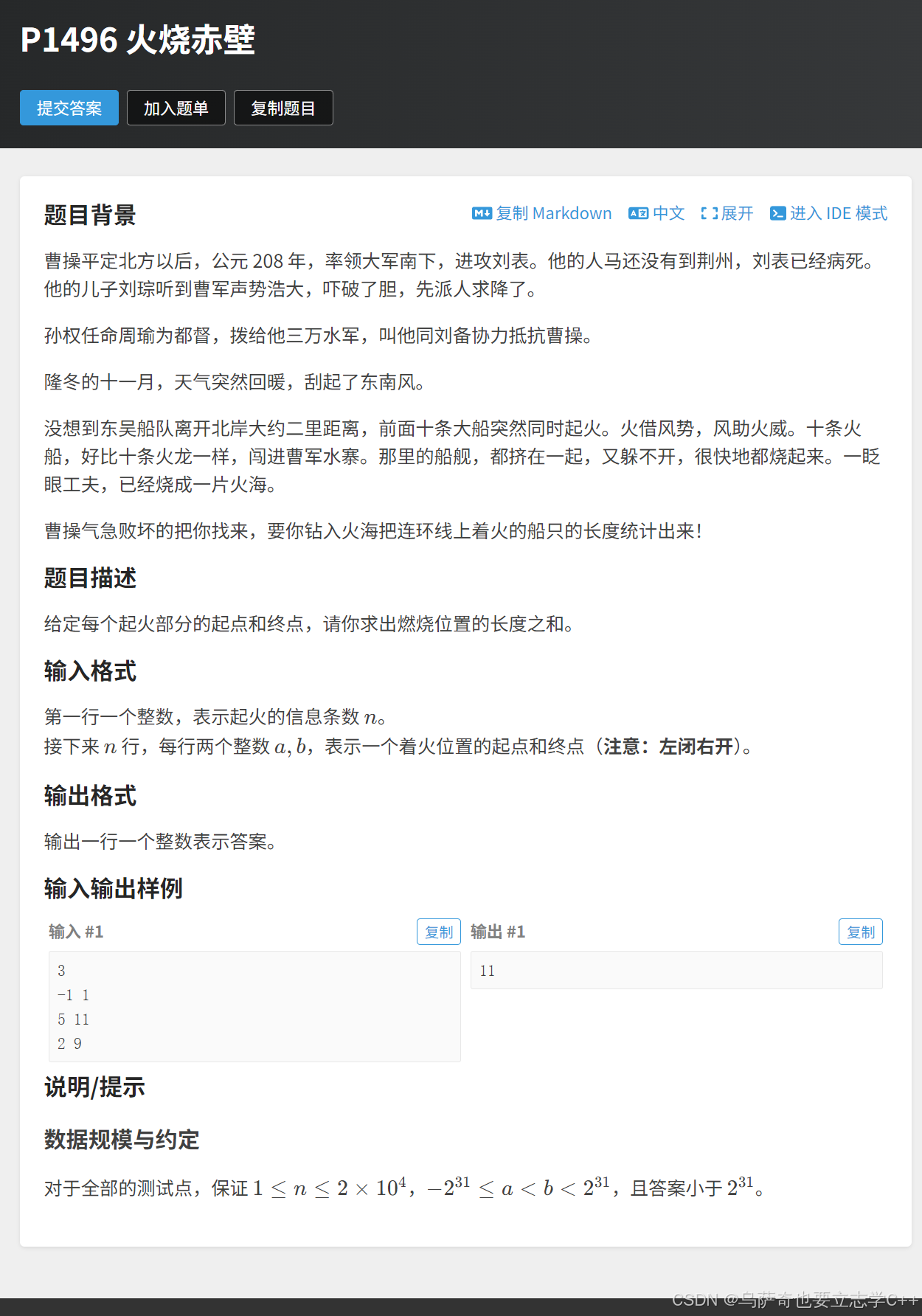 本题解题思路是离散化+差分,首先要统计被烧的区间长度,本质就是利用一个初始化为0的数组,若被烧就将对应的区间在数组中的数据整体加1,最后统计数组中不为0的数据个数即为被烧长度,而将数组中的一段区间整体加上一个数就可以用差分来处理。