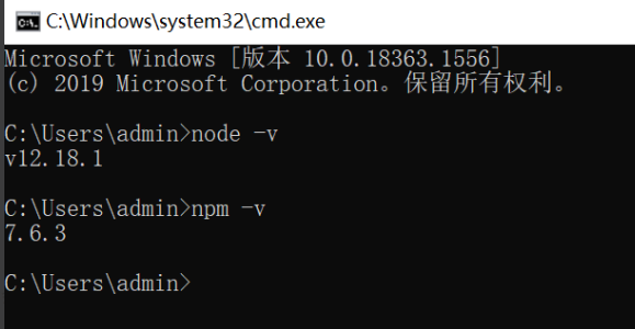 分别输入node -v和npm -v,测试安装是否成功(Node.js已经整合了npm)