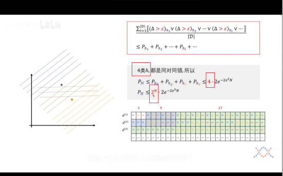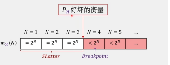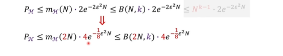增加一个数据点则可以拿到四类曲线,我们可以归类出来了2^N这个指数级别函数了。分母指数级别递增增长,因此无上界限,所以我们无法确定这个坏事情发生的概率是否会随着N的增加而变小,所以我们要继续推导,能否把2^N****降级!
