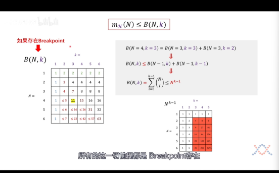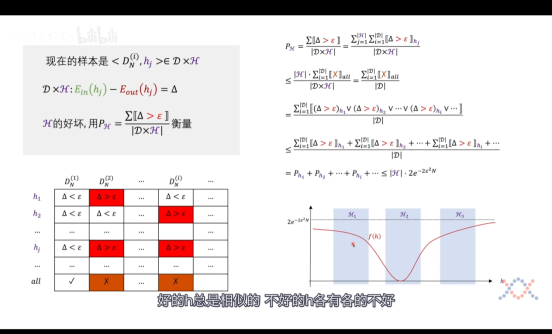 往后继续推论我们可以知道这样的h个数是**不会超过N^(k-1)的,至此,我们已经证明了 霍夫丁不等式**式子是可行的了,**随着N****数据集的增多,我们训练出来的模型表现坏的概率就越小**