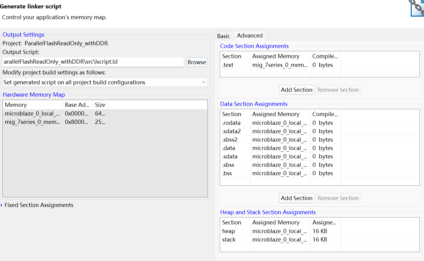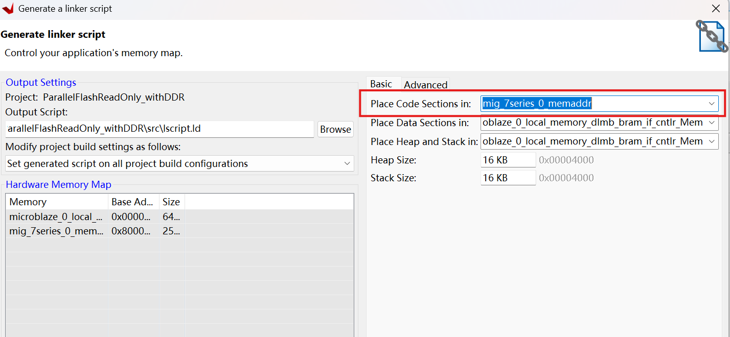 剩下的是vitis程序的开发,如果只运行在local memery上,直接开发应用程序即可,如果要运行在DDR上,还需要开发boot loader程序,详细的步骤可参考https://blog.csdn.net/ZLK1214/article/details/115875025。对于boot loader没有特殊点,只需要按照参考文章建立工程,更改应用程序的存储地址即可,对于应用程序,因为只需要下载elf文件即可,更改Generate Linker Script,只需要将code部分更改到DDR即可,当然其他部分也可以改到DDR,都运行在DDR上。