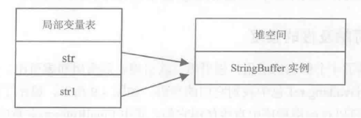 那么,str所指向的对象也将被str1所指向,同时在局部变量表上会分配空间存放strl变量,如图所示。此时,该StringBuffer实例就有两个引用。对引用的"=="操作用于表示两操作数所指向的堆空间地址是否相同。