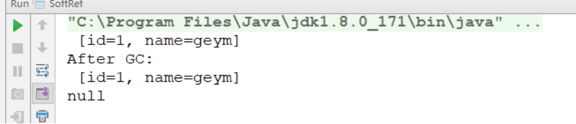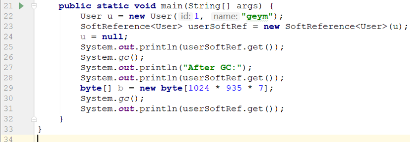 代码第24 行,在垃圾回收之后,在此获得软引用中的对象。