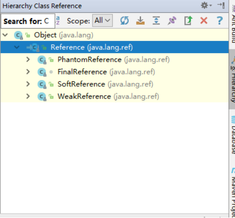 在Java中提供了4个级别的引用:强引用、软引用、弱引用和虚引用。除强引用外,其他3种引用均可以在java.lang.ref包中找到它们的身影。如图所示,显示了这3种引用类型对应的类,开发人员可以在应用程序中直接使用它们。其中FinalReference意味"最终"引用,它用以实现对象的finalize()方法, 后面会说。