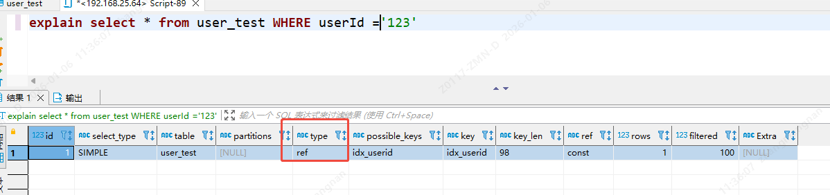 explain select * from user_test WHERE 1=1 and user_id ='1' and age ='123' and name ='1' -- 索引ref