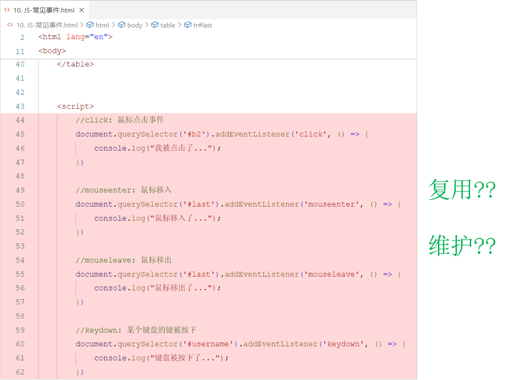 //通过JS为上述的表格中数据行添加事件监听, 实现鼠标进入后, 背景色#f2e2e2; 鼠标离开后, 背景色需要设置为#fff; (JS新版本的语法)