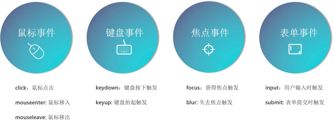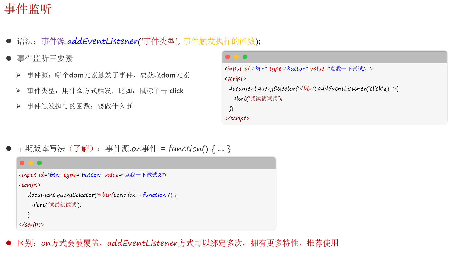 事件监听:JavaScript可以在事件触发时,就立即调用一个函数做出响应,也称为 事件绑定或注册事件。