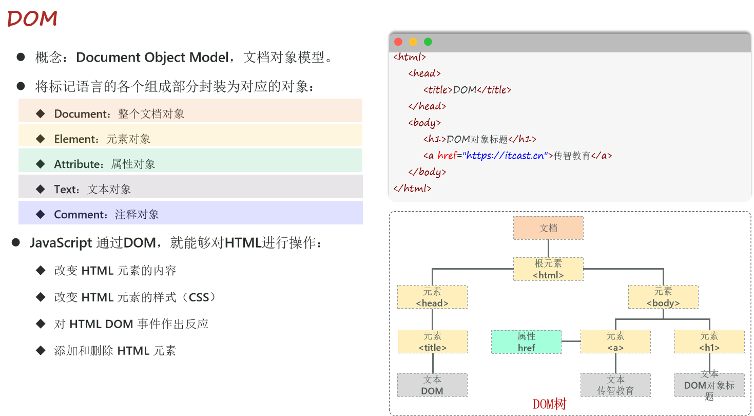 DOM:文档对象模型,用于操作HTML文档,如:改变标签内的内容、改变标签内字体样式等。