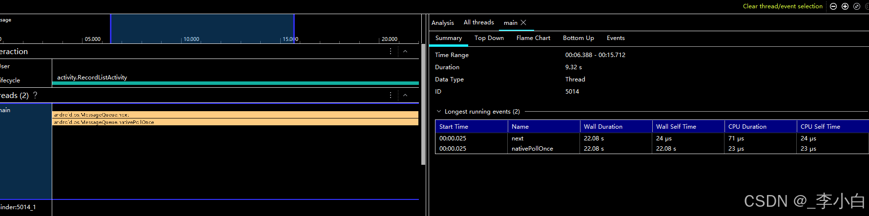 - 看线程视图:找到 "main"线程(UI 线程),如果它的"Running"状态占比很高,说明卡顿是 UI 线程被耗时操作阻塞导致的。