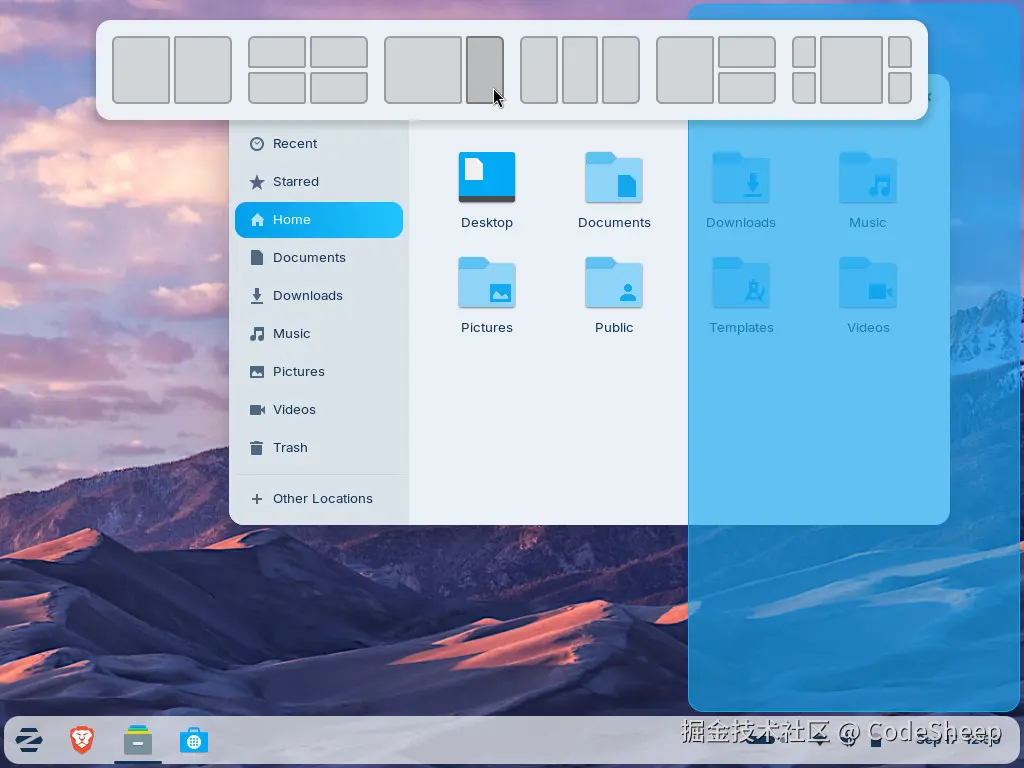 用户只需要把窗口拖到屏幕顶部,系统就会自动弹出布局选择器。